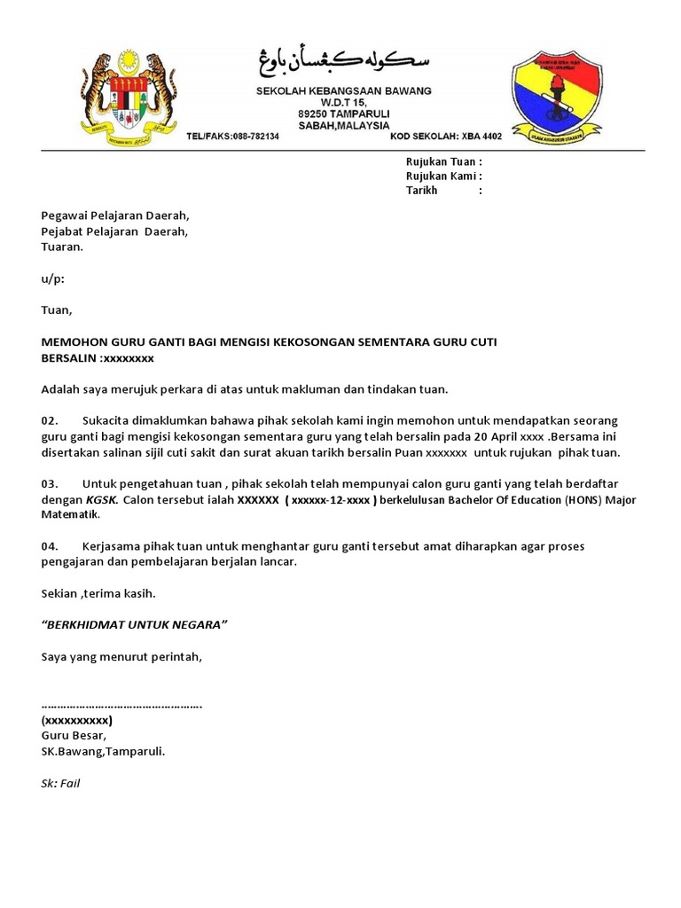 Posted by borang permohonan guru ganti (kgsk) at 11:40 pm no comments Berita baik buat anda yang berminat dan berkelayakan membuat permohonan guru ganti sekolah rendah dan sekolah menengah tahun 2021. Berminat untuk menjadi guru ganti? Isikan borang permohonan dengan huruf besar. Syarat tambahan bagi guru ganti bahasa tamil: Pemohon tidak perlu ke sekolah untuk memohon dan ppd akan menjalankan tugas mereka untuk menempatkan anda sebagai guru ganti. Use the download button below or simple online reader. Permohonan guru ganti tidak boleh digunakan bagi mengisi kekosongan perjawatan guru tetap yang belum diisi atau dikosongkan atas sebab persaraan, pertukaran, kenaikan pangkat, lanjut pelajaran bergaji penuh. Borang permintaan guru ganti kgsk sekolah. Lengkapkan borang permohonan bersama salinan surat cuti guru yang hendak diganti tindakan : Sedikit perkongsian untuk anda, cara apply permohonan umumnya, guru ganti ialah individu yang tiada latihan asas perguruan yang ditempatkan di suatu sekolah bagi mengisi kekosongan sementara guru tetap disebabkan cuti. Sekiranya anda berminat untuk mengisi kekosongan guru ganti tahun 2016 di daerah anda, sila klik pautan di bawah untuk memohon secara online. 2 permohonan guru ganti 2020 secara online.