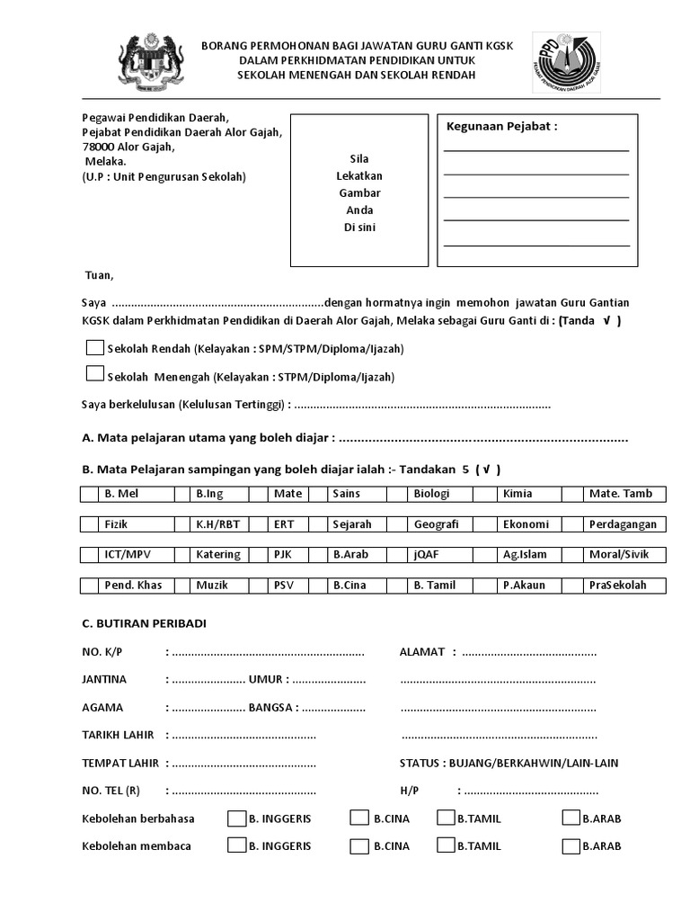 Documents similar to borang permohonan guru ganti (kgsk). Borang permohonan online guru ganti pulau pinang. Jika berminat, sila kemukakan permohonan anda sekarang dengan gaji yang lumayan. Borang permohonan menjadi ahli melebihi umur 65 tahun 3. Permohonan guru ganti tidak boleh digunakan bagi mengisi kekosongan perjawatan guru tetap yang belum diisi atau dikosongkan atas sebab persaraan, pertukaran, kenaikan pangkat, lanjut pelajaran bergaji penuh. Sekiranya anda layak, sila download dan isi borang di bawah. Anda pesara guru atau ada pengalaman mengajar atau sedang menunggu penempatan mengajar yang berdedikasi, iltizam, dan cemerlang, sertailah kami dalam kumpulan guru simpanan kebangsaan (kgsk). Tekan menu 'borang permohonan permit'. Permohonan jawatan guru ganti di bawah adalah dari jabatan pendidikan negeri perak. Antara syarat permohonan jawatan ini ialah: Pemohon tidak perlu ke sekolah untuk memohon dan ppd akan menjalankan tugas mereka untuk menempatkan anda sebagai guru ganti. Posted by borang permohonan guru ganti (kgsk) at 11:40 pm no comments Sihat tubuh badan dan tidak cacat pancaindera.