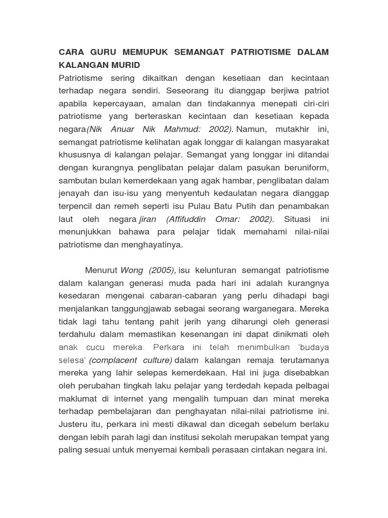 Karangan peranan ibu bapa dalam memupuk semangat patriotik. Sesungguhnya, semangat patriotisme akan membentuk rakyat yang lebih mementingkan kepentingan rakyat yang patriotik diibaratkan seorang individu yang sanggup mengorbankan dirinya untuk kepentingan negara tanpa banyak alasan. Bagaimana cara langkah memupuk semangat patriorisme generasi muda remaja di malaysia. Sememangnya, keluarga memainkan peranan yang sangat signifikan dalam memupuk semangat. Sekiranya semangat patriotik dapat dipupuk sejak kecil, sudah tentulah semangat patriotik akan terus diamalkan dan dikekalkan hingga dewasa. Cara lain yang boleh dijalankan adalah dengan membuat pengubahsuaian dan memberikan penekanan tentang aspek semangat patriotik ini dalam. Memupuk kasih sayang di antara anggota masyarakat. Pelbagai usaha boleh dilakukan untuk memupuk semangat cinta akan negara dalam kalangan remaja kini. Mutakhir ini semangat patriotik dalam kalangan generasi muda semakin pudar. Selepas itu memupuk semangat nasionalis bagi mengisi kemerdekaan. Semangat patriotisme juga dapat memupuk perpaduan kaum. Kesavarthinee chandran 6 months ago. Hal ini berlaku demikian kerana.
