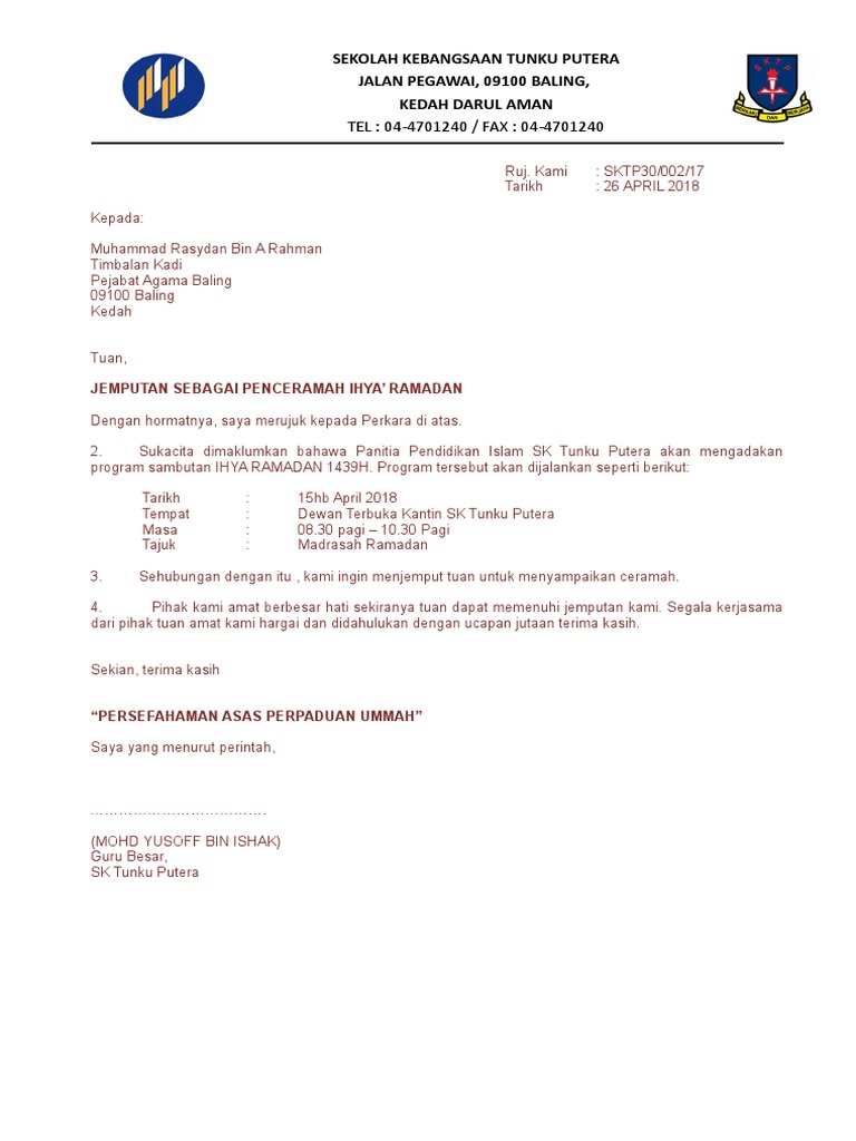 Gambar contoh surat jemputan penceramah kem motivasi terbaru 2019. In these page we also have variety of images available. Jumlah 1 bayaran rm 150 x 2 pibg rm 300.00 penceramah jemputan jumlah rm 300.00 kesimpulan program ini diharap akan dapat memberi impak kepada pelajar dalam mempelajari teknik menjawab yang berkesan seterusnya meningkatkan pencapain mereka bagi mata pelajaran bahasa inggeris. Contoh surat jemputan penceramah 1. Sekolah kebangsaan sungai tukang sidin 36750 chikus, perak program peningkatan akademik 2013 kertas cadangan bengkel kecemerlangan upsr objektif : Penceramah adalah terdiri dari penceramah jemputan/majikan/uitm manakala trainer/jurulatih terdiri dari pensyarah, kaunselor serta ahli alumni. Surat jemputan perasmi penutup via ar.scribd.com. (i) templat untuk abstrak tersedia untuk dimuat turun melalui pautan ini. Terangkan secara ringkas tetapi jelas tujuan kertas kerja ini dikemukakan 3. Contoh format kertas kerja kertas kerja nama program (tajuk program) kod kulliyyah/ kumpulan kluster: Projek peruntukan khas program kemerdekaan yang majoriti dari murid murid kelas ini terlibat tahun le pas, maka bengkel ini dijalankan khusus untuk to pik yang mereka lemah sewaktu pe periksaan akhir tahun ting 4 yang. Bengkel kemahiran asas pertolongan cemas kertas kerja majlis ilmu persatuan bulan sabit merah, sekolah menengah kebangsaan kelapa sawit 1.0 tujuan kertas kerja ini dikemukakan untuk mendapatkan kelulusan pihak pentadbir smk kelapa sawit mengenai program yang dianjurkan oleh persatuan bulan sabit merah smk kelapa sawit yang bertajuk 'bengkel kemahiran asas. Tajuk hendaklah ringkas, jelas dan padat 2.
